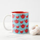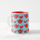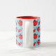 Cute illustrated pattern of a red and white spotty teapot and teacup set on a light blue background.