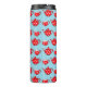 Cute illustrated pattern of a red and white spotty teapot and teacup set on a light blue background.