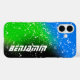 Personalize by adding a name or remove the text for this bright green, black, and blue spray paint style, custom name phone case.