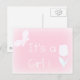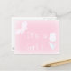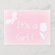 Spring baby girl - personalized birth announcement postcard. Delicate text design in light pink with white text "It's a Girl" .It features the white silhouette of a tulip and a butterfly .Ideal for announcing the birth of a cute baby girl who was born in spring .