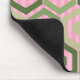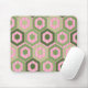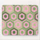 This mouse pad has a geometric design of hexagons in four shades of green on a field of pink stripes in two shades.