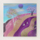This gorgeous abstract landscape depicts a rolling hillside scene with blooming spring trees and birds in shades of pink, purple, beige, tan, gold, green, and blue.