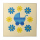 Hand-cut blue baby carriage with blue ribbon and glued blue buttons on the wheels, light yellow background on Ceramic Photo Tile for kitchen and home decor. *Every things you see on the products are hand made, but you must know that you get a photo!