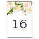 Garden floral table number cards feature a top border of watercolor rose and peony flowers in ethereal pastel shades of blush pink, cream and green, with your table number in midnight blue. Design repeats on reverse side. Coordinates with our Spring Blush wedding invitation suite.