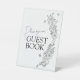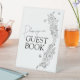 Stylized spring floral line art please sign our guest book table sign. Simple line art featuring, spring blossom, tendrils and butterflies along the side. A simple monotone black and white design to personalize with your words if required. Matching signs and other wedding items and colour options are available and or can be created on request. © Original hand drawing and design by Sarah Trett for www.mylittleedenweddings.com on Zazzle.