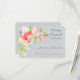 This pretty wedding response card features a pretty spring floral bouquet in colours of coral pink, lavender pink, white, pale yellow, gold, and blue nestled among green leaves at the top left corner. The design extends to the lower left, forming a pretty border for your custom text. The text is in grey and blue green at the right. The watercolor floral image and text are placed on a lighter soft grey background, which complements the bright colours in the flowers. The back of the invitation is the same grey colour. This response card has matching wedding invitations and other wedding products in our store.