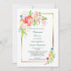 A pretty spring floral bouquet in colours of coral pink, lavender pink, white, pale yellow, gold, and blue nestle among teal green leaves at the top left corner of this wedding rehearsal dinner invitation. A smaller coordinating floral image is at the bottom right. Behind the two images is a shiny gold frame, which encloses your custom text. The text is in grey and teal green at the centre. The watercolor floral image and text are placed on an white background. The back of the invitation is solid antique gold. Be sure to see the matching wedding products in our store.