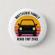 Cool custom road trip button for spring break or summer vacation with your family or friends. Personalize with your last name or group above the retro sunset and car silhouette. Perfect keepsake for a trip to a cottage or across the country. Drive off into the sunset.