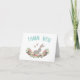 A cute thank you note card perfect for spring and Easter, featuring the phrase "thank you" in light teal brush lettered font and a delightful illustration of a rabbit sat in the middle of a floral bouquet/bough, and flying bees.