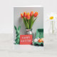 This greeting card shows a spring tabletop scene set against a bright white background, arranged with a calm, close-together feel like friends leaning in for a photo. On the left sits a glossy green ceramic bunny with upright ears and a relaxed face 🐰. Just beside it, a red card stands upright with a short Easter message centred in small white letters, drawing your eye like a quiet note passed between loved ones. Behind them, a bouquet of tulips rises from a fluted silver vase, with petals shifting from orange to soft yellow and green stems filling the space with fresh colour 🌷. On the right, a pale green carton holds decorated eggs, mixing black dots, orange spots, and simple stripes that look carefully chosen rather than rushed. Soft, diffuse light smooths the surfaces and adds gentle highlights to the ceramic, the vase, and the egg shells, keeping the arrangement tender and inviting. The eggs sit snugly in the carton, each pattern clearly visible against the pastel green edges.