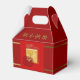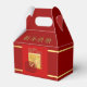 Red Ox paper-cut on Asian painting with greeting in English in front (gold lettering and drop shadow not customizable) + Chinese greeting. Design on Gable favour box. You can easily change background colour by clicking the customize button. Available in other styles of favour boxes (cube, tent, take-out). Matching gift bag, greeting card, postcard and other craft products. Perfect for Chinese New Year of The Ox 2021.