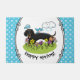Springtime Dachshund - Cute, smiling, black and tan Dachshund playing in the grass with blooming flowers, pretty bluebirds, and a happy, smiling, raining cloud. Copyright © Angi Laframboise. Cute seasonal dog breed cartoon gifts for dog lovers.