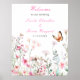 Pretty wedding welcome sign with wildflowers in pink, and cute butterflies. Perfect for a spring or summer wedding. The words can be changed to suit your own details or requirements
