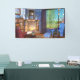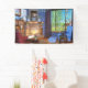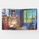 A cozy reading corner on a sunny spring day. Warm sunlight streams in through the lattice windows, leaving shadows on the wall and lighting up the cherry blossom "snowglobe" on the bookshelf. In the window is a colourful suncatcher sparkling in the light. Around the hearth are cushy armchairs, with vases of flowers and books and a steaming teacup, but the windows are open to let in the spring breeze. Outside a spring-green willow and beech hedge and red Japanese maple are surrounded by tulips and cornflowers, while a ginger cat stalks through the long grass.