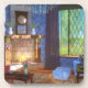 A cozy reading corner on a sunny spring day. Warm sunlight streams in through the lattice windows, leaving shadows on the wall and lighting up the cherry blossom "snowglobe" on the bookshelf. In the window is a colourful suncatcher sparkling in the light. Around the hearth are cushy armchairs, with vases of flowers and books and a steaming teacup, but the windows are open to let in the spring breeze. Outside a spring-green willow and beech hedge and red Japanese maple are surrounded by tulips and cornflowers, while a ginger cat stalks through the long grass.