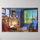 A cozy reading corner on a sunny spring day. Warm sunlight streams in through the lattice windows, leaving shadows on the wall and lighting up the cherry blossom "snowglobe" on the bookshelf. In the window is a colourful suncatcher sparkling in the light. Around the hearth are cushy armchairs, with vases of flowers and books and a steaming teacup, but the windows are open to let in the spring breeze. Outside a spring-green willow and beech hedge and red Japanese maple are surrounded by tulips and cornflowers, while a ginger cat stalks through the long grass.
