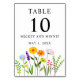 Elegant floral wedding table number cards featuring pink, yellow, purple, flowers and leaves at the bottom of the design. The design is repeated on the back. Perfect for spring and summer weddings. To order table cards: Add your names, wedding date and table number. Add each number to your cart separately and check out when you are done.