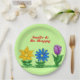 Pretty flowers in the garden green grass with golden yellow flower, blue flower and purple tulip with green leaves. With the wording, Smile and be happy in red text. Fun and cheery disposable paper plates to use during the spring and summer months. Leave wording or personalize it or delete text. Shown on a pretty light green background. Original Graphic Artwork by TamiraZDesigns.