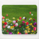 Spring flower border filled with tulips and narcissi with a lush green lawn.