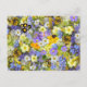 A pretty, colourful, floral postcard featuring a lovely image of spring flowers of all types, including yellow daisies, white daisies, and blue, white and purple flowers.