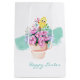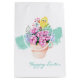 This design has a terra cotta flower pot with beautiful flowers in full bloom. At the top of the arrangement there is a little yellow baby chick. In the background there's a splash of a mint green colour. The text, 'Happy Easter', can be personalized with a name special occasion or event.