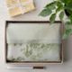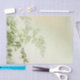 Design features a beautiful image of overhanging green leaves on top of a cream-colored background. It evokes the beauty of nature in springtime.