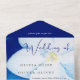 Wedding Invitation with Snow-white flower on bright blue clearance water background, azure teal watercolor painting, airy coloured spring or summer spotted floral background. White lily botanical elegant floral blossom Wedding Invitation. Spring Fondness Collection.