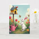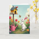 Designed with a gentle spring garden scene, this card features a white rabbit standing upright in the grass, head tipped up as if admiring two orange-and-black butterflies drifting overhead 🐰. Around the rabbit, rows of tulips in red, orange, and soft purple rise on green stems, adding a cozy, friendly mood like a shared walk with someone close 🌷. Off to the left sits a small yellow birdhouse on a wooden post, topped with a dark roof and a tiny white fence detail that feels like a sweet little home. A bright red bird perches on the roof peak, angled toward the rabbit as if watching over the moment. Near the base of the post, a pink watering can rests in the grass, hinting at patient care and quiet togetherness. A winding trail of uneven stepping stones leads through the garden, drawing the eye deeper into the scene beneath a pale blue sky with soft clouds. The greeting text is placed near the top in a light, easy-to-read colour that stands out gently against the sky. Fine details include the tulip petals shaded from base to tip and the butterflies’ patterned wings outlined crisply against the open air.