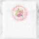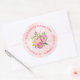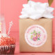 Custom circle return address stickers personalized with your family name and address around a bright pink and green watercolor floral bouquet. Use the design tools to change the background colour and fonts to further customize your own unique design.