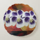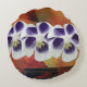 White and purple flowers, yellow, orange,red background. Abstract art collage design on round cushion.