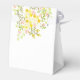 Lovely wedding favour box in a cheerful yellow and green colour scheme on a crisp white background. Original illustration of floral blooms and greenery adorn the top front and back of the box. Personalize with your text, the bride and groom names and wedding date. Perfect for an outdoor, spring, summer, evening, or garden wedding.