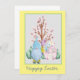 Cute aquarelle tomte style gnome avec bouquet de fleurs Printemps doux, une maison en forme d'oeuf, arbre en fleurs et arrière - plan jaune pastel avec texte personnalisable "Happy Easter".