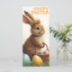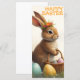 A cute Easter bunny with a flower crown sits lovingly amidst colourful Easter eggs. He holds a small wicker basket with painted eggs in his paws. The scene is surrounded by delicate spring flowers and warm light. The inscription "Happy Easter" shines above the bunny in cheerful orange - a warm greeting that captures the lightness and joy of the spring festival.