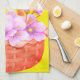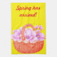 blue kitchen towel has a basket of purple and pink flowers just in time for spring