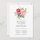 Elegant watercolor botanical rehearsal dinner invitation with your wedding ceremony rehearsal and dinner celebration details with a bride bouquet of watercolor green leaves and bright flowers in pink and blue and purple.