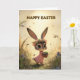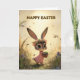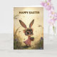 This adorable Easter card features a sweet baby bunny in a pink embroidered dress, wearing a soft floral crown and carrying a basket of colorful eggs. Surrounded by tall glowing grass, pastel flowers, and fluttering butterflies, the artwork captures a dreamy springtime atmosphere. Perfect for kids, families, and anyone who loves warm, whimsical Easter designs. Printed on premium cardstock for a beautiful seasonal keepsake.