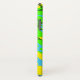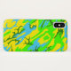 Camouflage cell phone case in bright yellow, blue and green.