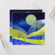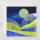 An abstract landscape depicting rolling hills with a blooming spring tree and plants and a moon and stars in shades of blue, cyan, yellow and pink.