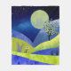 An abstract landscape depicting rolling hills with a blooming spring tree and plants and a moon and stars in shades of blue, cyan, yellow and pink.