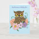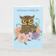 Cute little brown owl sitting amongst paste pink, peach and purple Spring flowers in backdrop of light blue