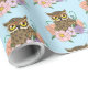 Cute little brown owl sitting amongst pastel pink, peach, and purple flowers against light blue background