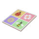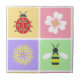 Pastel pink, yellow, purple, and green squares are adorned with ladybugs, dogwood blossoms, daisies, and honeybee and then bordered by tight white stitching to create a fun and sweet spring patch-like pattern. This tile can be framed to create a trivet or placed inside a wooden gift box lid. Tiles without a frame will also fit inside the large gift box to create a matching set.