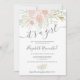 it's a girl, a modern and elegant floral watercolor girl baby shower with hand painted soft pastels blush pink and green mint flowers arrangement and modern and chic script calligraphy.