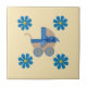 Hand-cut peach colour baby carriage with blue bow and blue ribbon and glued blue buttons on the wheels, light yellow background on Ceramic Photo Tile for kitchen and home decor. *Every things you see on the products are hand made, but you must know that you get a photo!