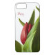 A cell phone case with a floral photograph of the Birth of a Spring Red Tulip surrounded by curved leaves against a white background. This nature photography will make a unique case/cover that can be personalized and customized. Use the template to easily change the text on the front to your name or initials. To change the font, size or colour, click on the "Customize it" button.