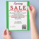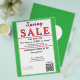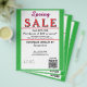 Jewelry or any business type supplies. Bright springtime green border. Insert Sale price and date details. Upload Your Logo, or delete to leave area blank. Insert Name and Website or other contact QR Code. Spring written in pink script. Sale written in large red typography. Thank You is written inside large white heart on backside. Original Design by TamiraZDesigns.