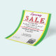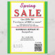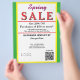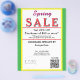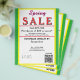 Jewelry or any business type supplies. Bright springtime yellow and green background. Insert Sale price and date details. Upload Your Logo, or delete to leave area blank. Insert Name and Website or other contact QR Code. Spring written in pink script. Sale written in large red typography. Thank You is written inside large white heart on backside. Original Design by TamiraZDesigns.