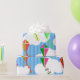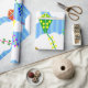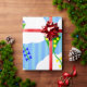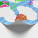 This wrapping paper has a geometric design of kites flying in the clouds of a blue striped sky. It is very colourful and festive.