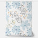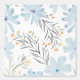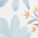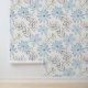 Our design features light, serene blue flowers (like sky blue/aqua) painted in a delicate watercolor style. These flowers are interspersed with gray-green leaves and soft yellow/orange flecks, giving the pattern depth and a warm, earthy contrast.