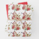 Teapots surrounded by red roses on three different sheets of wrapping paper.